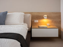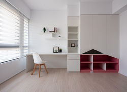 當我們汲汲把生活裝得更美麗耀眼時,無非是希望生活的更好,過多的形式而忘了生活的本質。 屋主夫妻分隔兩地工作,想要相聚時能自在、慵懶的和家人一起度過美好時光,其實僅是對於小日子裡優雅步伐的追求和安心日常的嚮往,電視牆抹上了珪藻土,細緻的紋路本質,沙發背牆鋪陳的跳色讓整個空間活潑起來更顯得愜意,為避免油煙四溢,用玻璃築起折疊門,讓整個空間視線得以延續,孝親房的榻榻米床鋪融入一絲絲日式的氣息,也讓空間運用更靈活,主臥簡約風格配上一盞中式吊燈串起整個空間,小孩房的粉紅色是妹妹喜歡的顏色,衣櫃特意做了造型讓空間更顯得活潑,在去蕪存菁後淬鍊出最單純的本質需求,以愛為內涵,描繪永不失味的機能空間顯學。
