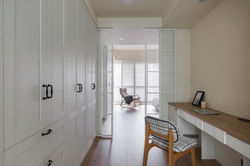 屋主一直有個夢想擁有一個可以和兒童互動的閱讀空間,因此特意把書櫃挪到客廳,讓客廳和閱讀空間巧妙結合出悠閒的閱讀區域,客廳和餐廳間以玻璃門做區隔,將光線引入餐廳讓空間不會太壓迫,透過文化石點綴的電視牆多了一點人文的氛息,整個空間以淺色調為主,搭配上一點木皮的溫潤,呈現出屋主想要的放鬆優閒的感覺。